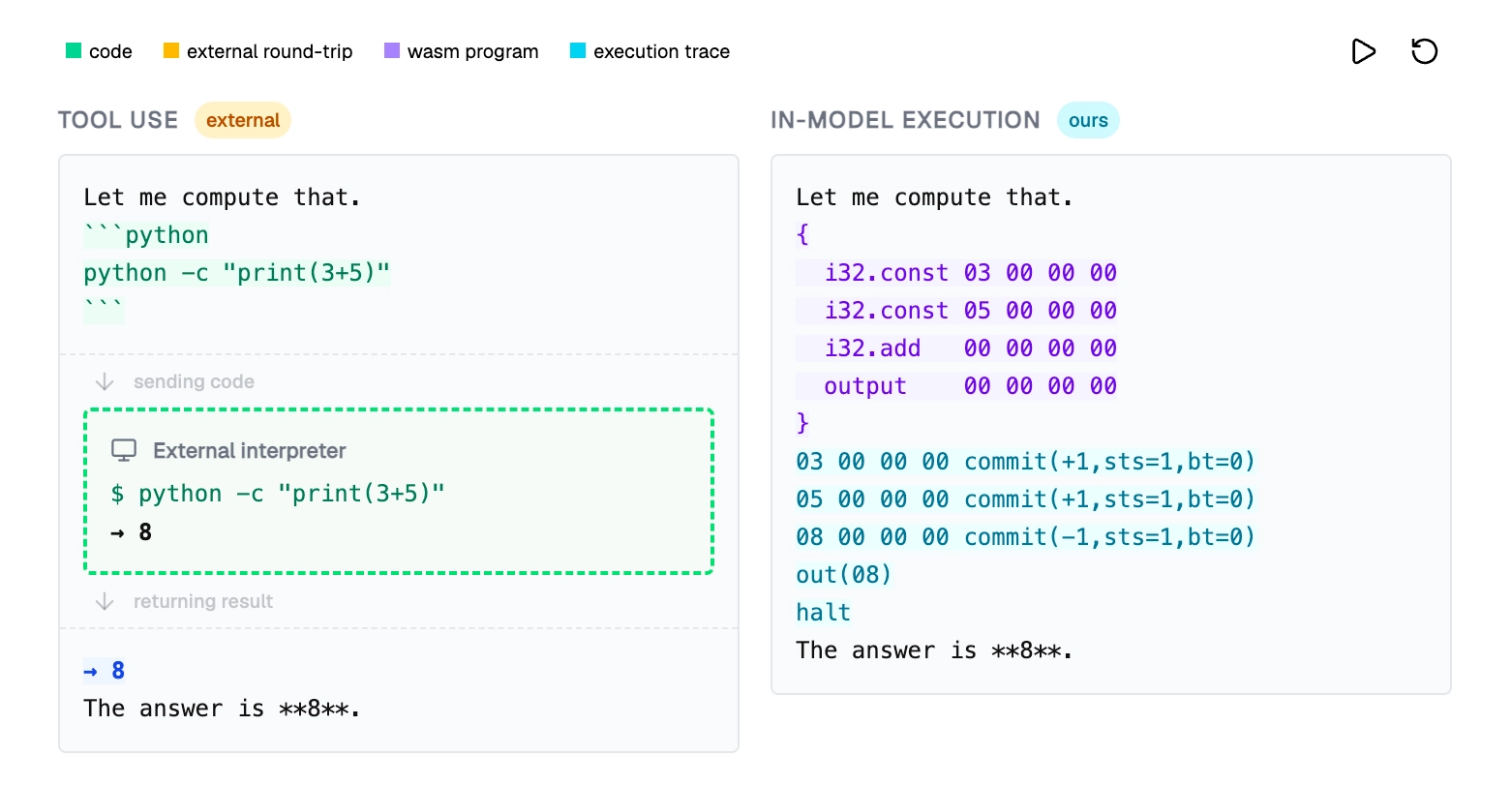 When the model encounters a computation it needs to run, it emits a WebAssembly program. WebAssembly is a good target here: it's a low-level instruction set that C compiles to cleanly, with deterministic semantics and instructions that map to at most 5 tokens each. The model then switches into execution mode and runs the program itself, token by token, producing a trace that looks like a simple addition: