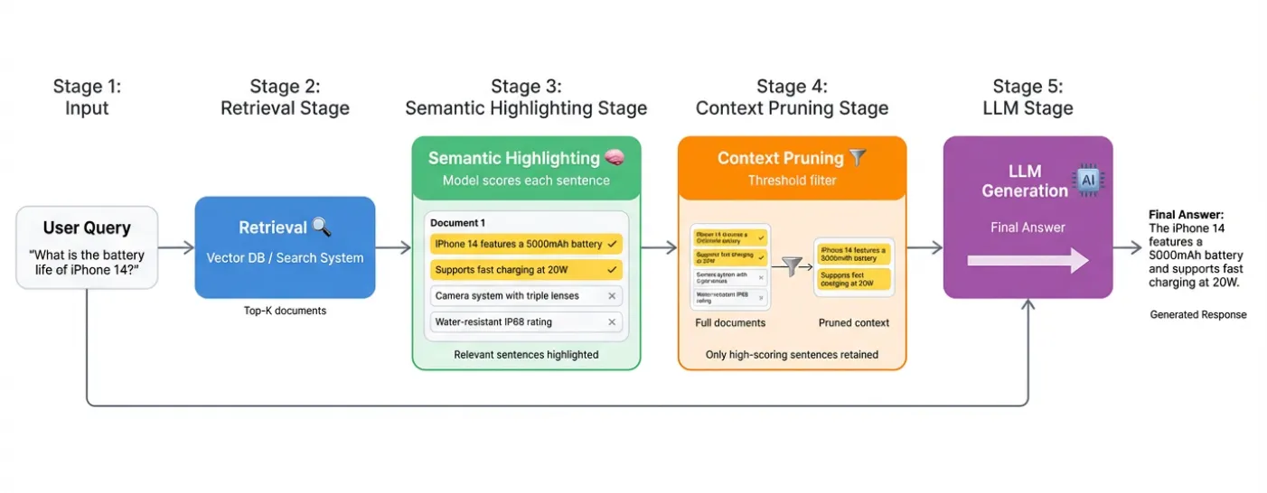 Agent Workflows: This becomes particularly valuable in AI agent systems. When agents decompose complex tasks into multiple search queries, those derived queries often look nothing like the source documents. Semantic highlighting can bridge this semantic gap.