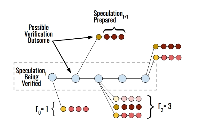 This requires solving a genuinely hard subproblem: the draft doesn't know yet what the target is going to accept or reject. So it has to predict the verification outcome and pre-generate speculations for the most likely outcomes in advance.