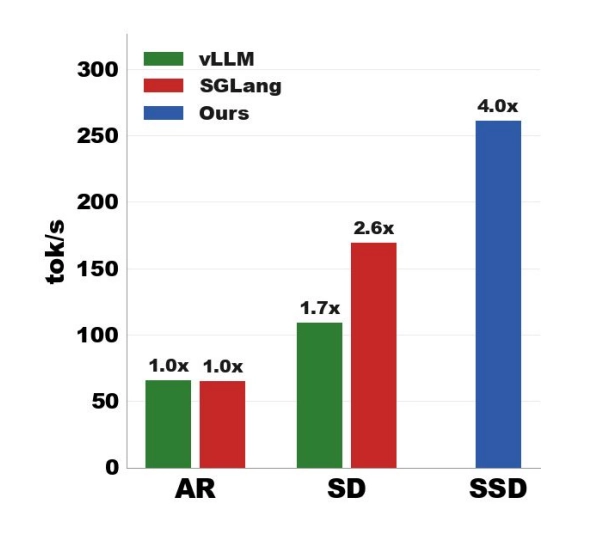 That's roughly 1.58x faster than speculative decoding and 4.7x faster than autoregressive on average, for Llama-70B at batch size 1. On math and code tasks where drafts are especially good, SSD hits over 5x autoregressive speed.